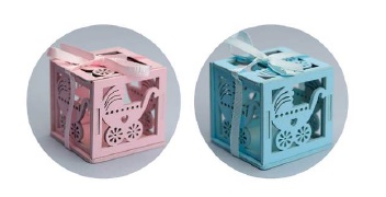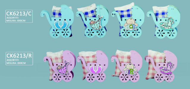 Bomboniera box legno nascita carrozzina c/sacchetto cm.8x8 ass.4 modelli