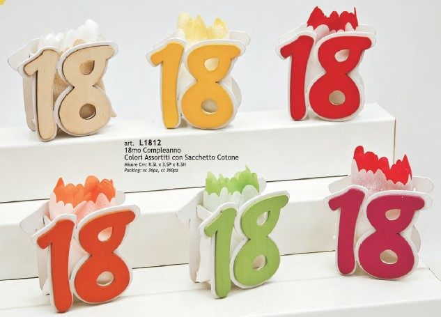 Bomboniera box legno c/sacchetto 18° compleanno cotone cm.8,5x3,5x8,5