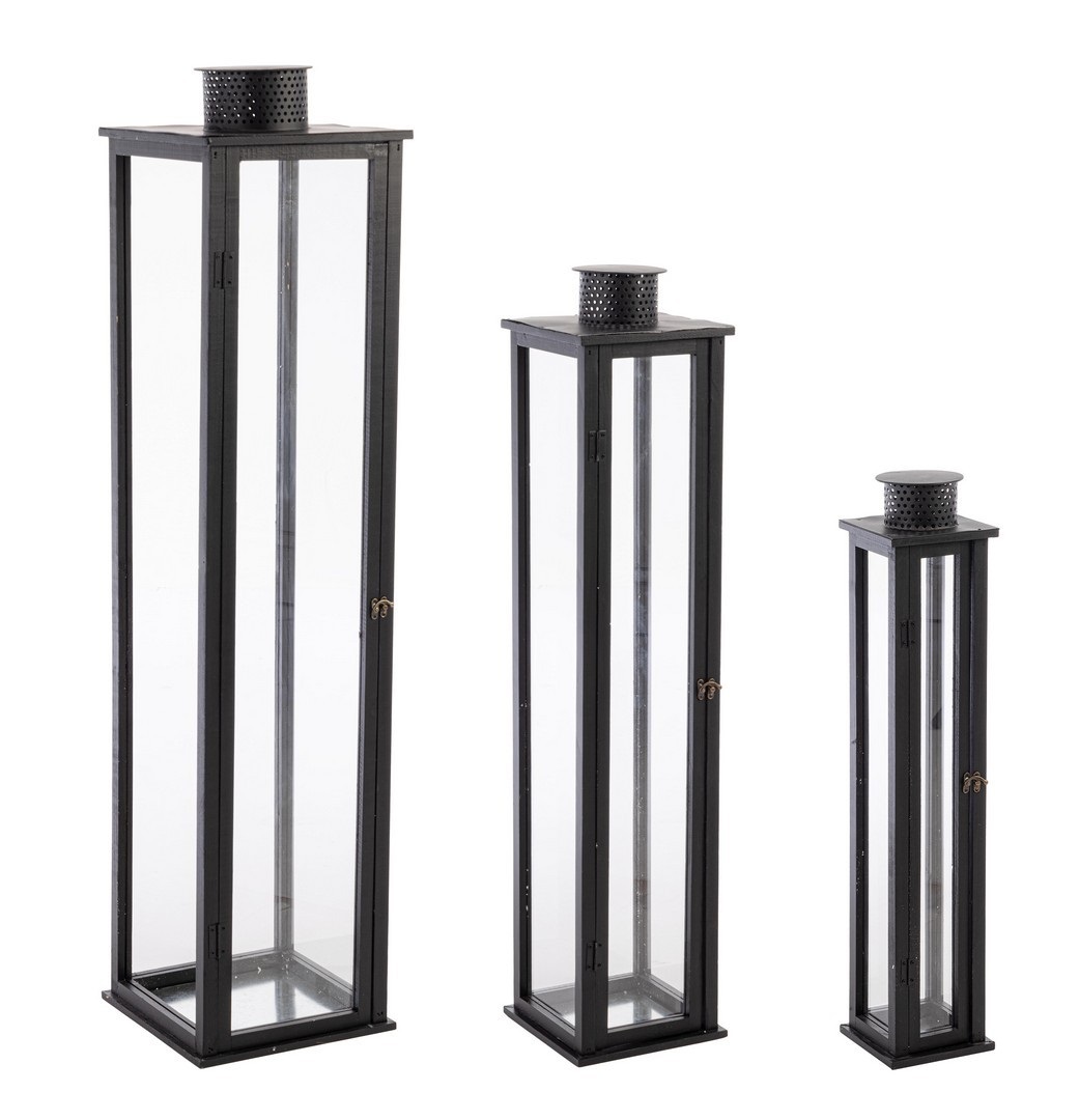 Lanterna set 3pz torsti rettangolare nero p.cm.15,5x15,5x78 md.cm. 22x22x103 gr.cm.30x30x129