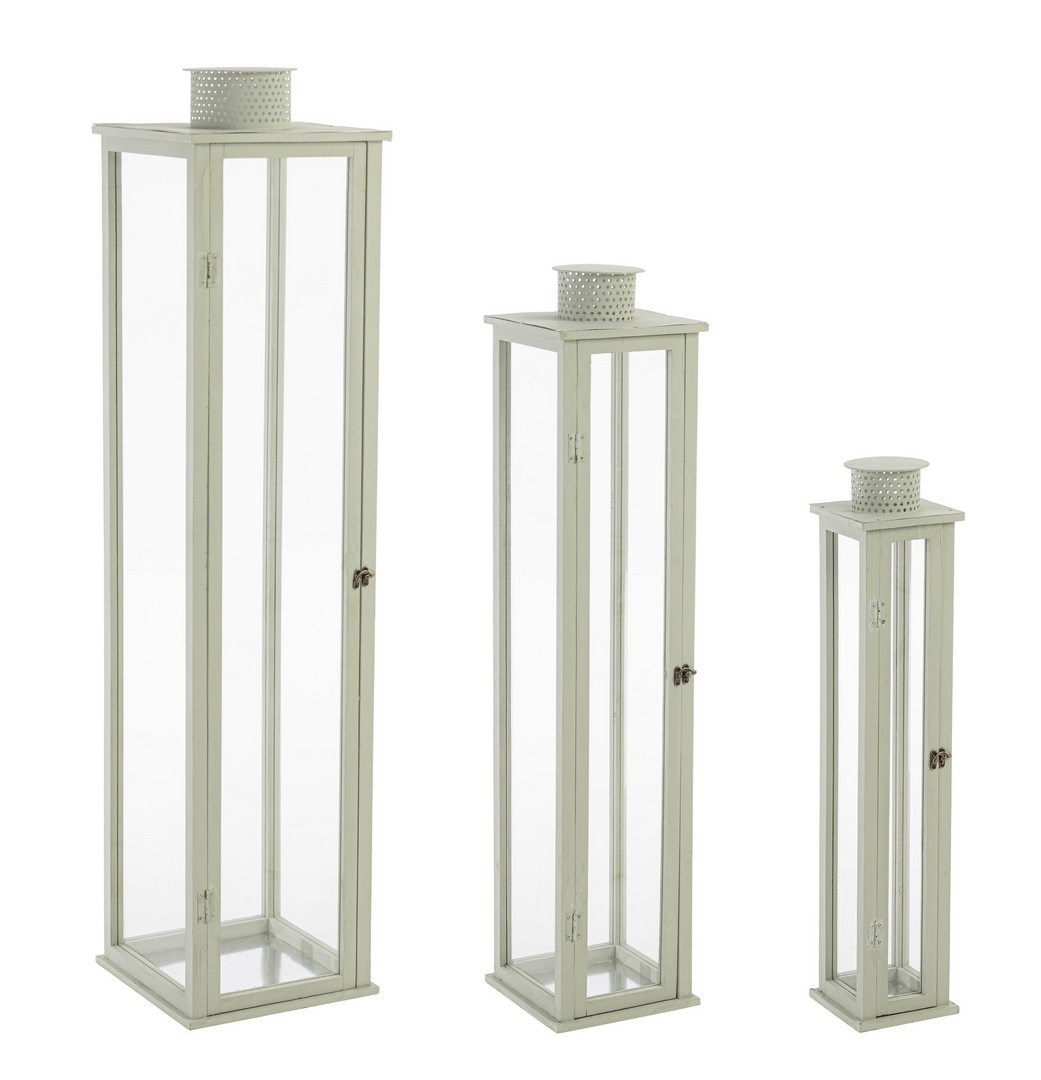 Lanterna set 3pz torsti rettangolare verde salvia p.cm.15,5x15,5x78 md.cm. 22x22x103 gr.cm.30x30x129