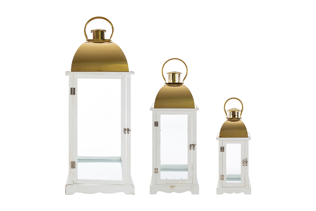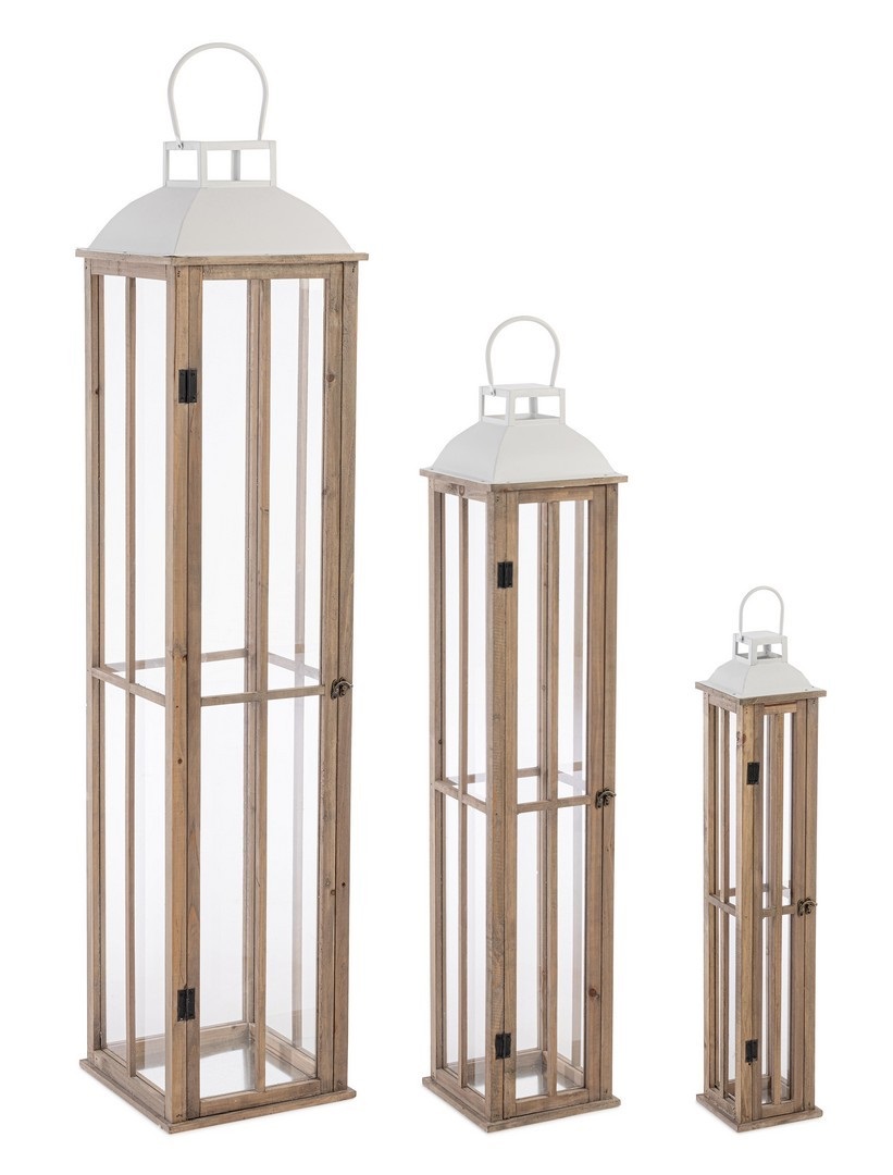 Lanterna alluminio,vetro e legno set 3pz bianco g.cm.20x20x53,5 m.cm.15x15x36,5 p.cm.11x11x24,5
