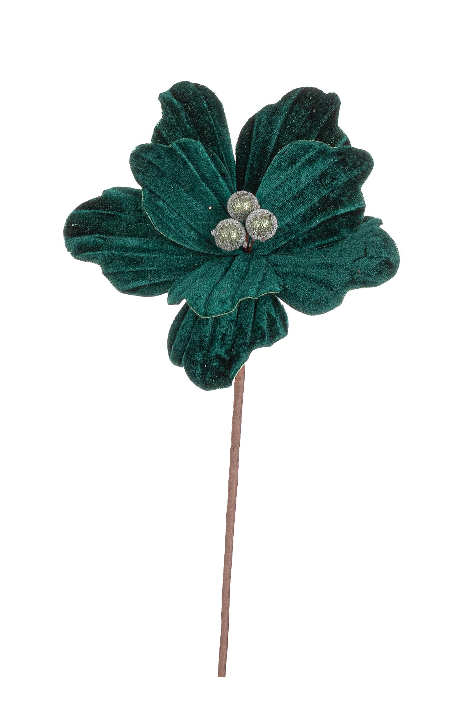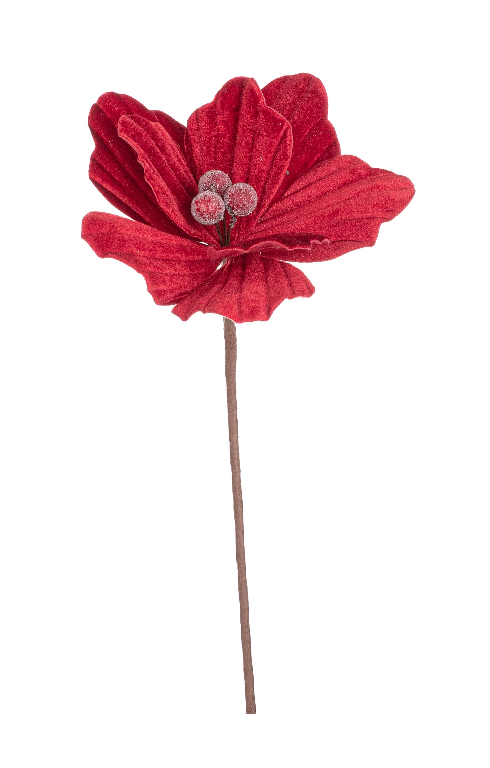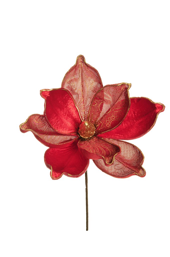 Natale pick fiore magnolia in velluto c/petali di rete e bordi oro d.20 h.29