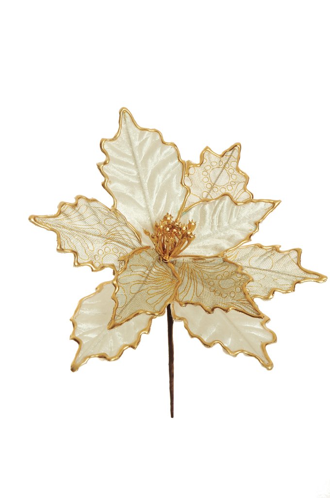Natale pick fiore poinsettia in velluto c/petali di rete e bordi oro d.22 h.26